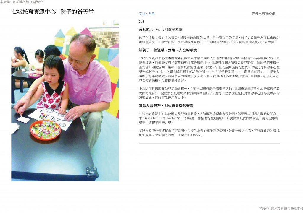 謝謝基隆市政府社會處 給予家中育有6歲以下的親子們一個快樂學習的地方, 歡迎爸比、媽咪們多帶孩子一起來體驗基隆市七堵托育資源中心的空間設施,中心將陪伴孩子一起成長唷!